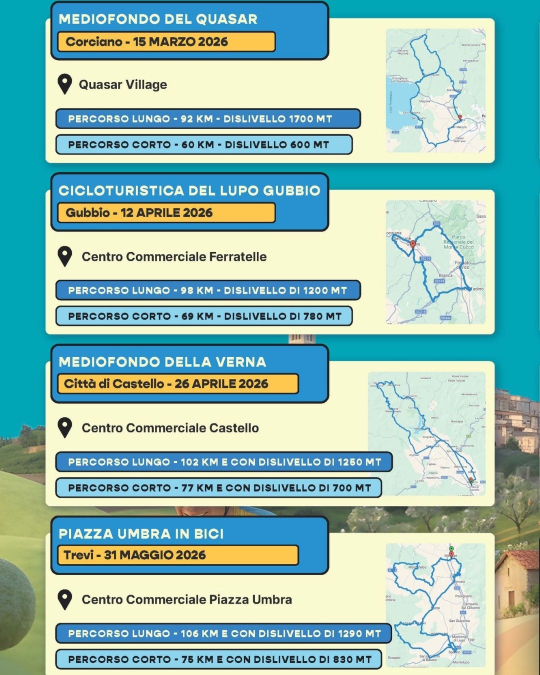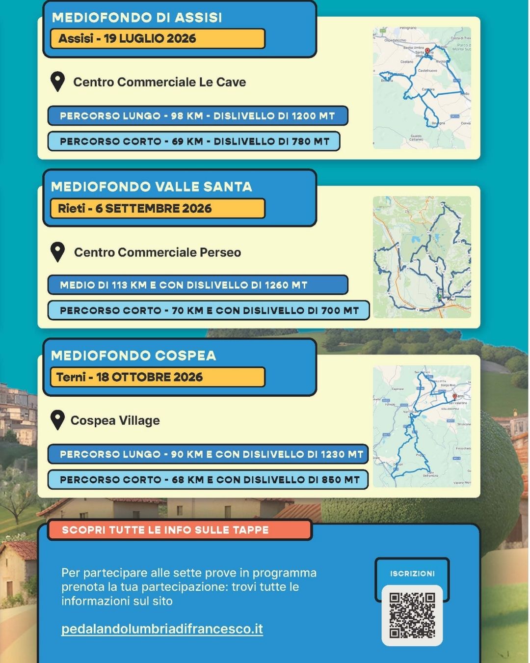 Participants may also register on April 11 for €25 at BIKE_SYSTEM360 (Via Montello, 11 – Gubbio) from 3:00 PM to 7:00 PM, and on Sunday, April 12 for €30 at CENTRO COMMERCIALE FERRATELLE from 7:00 AM to 8:15 AM.