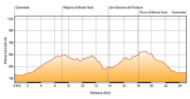 There are no really steep stretches, but the long climb from Migiana di Monte Tezio must be added to the many ups and downs along the whole way, making it rather hard. The distance is suitable for everyone, however.