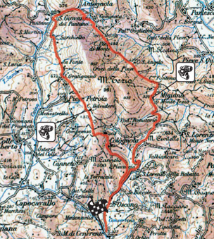 The route starts at the church at Cenerente, just a few kilometres from the centre of Perugia, then winds itself around Monte Tezio, where there are wonderful views of the valleys below.