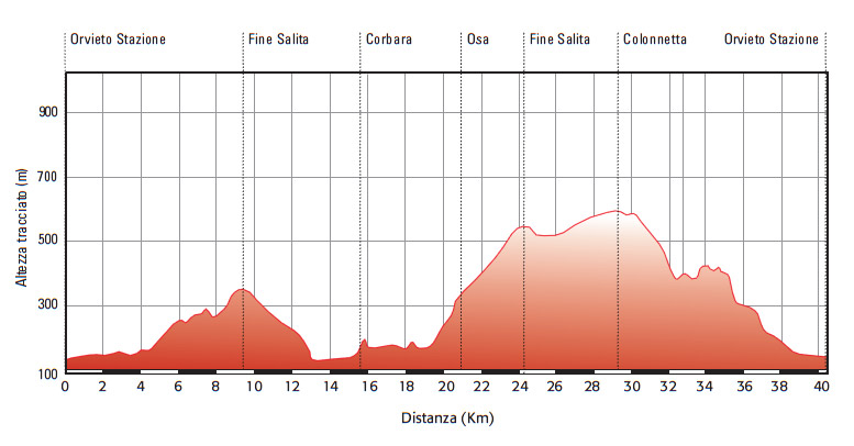 Questo itinerario parte dal parcheggio antistante la funicolare che da Orvieto Scalo conduce a Orvieto centro, a pochi metri dalla stazione ferroviaria. Una vicinanza che consente di optare anche per la soluzione treno+bici.  Il percorso è abbastanza scorrevole, poiché non presenta tratti particolarmente tecnici o sconnessi, ma il chilometraggio elevato (40 chilometri) e la presenza di due salite impegnative lo includono negli itinerari di livello difficile.