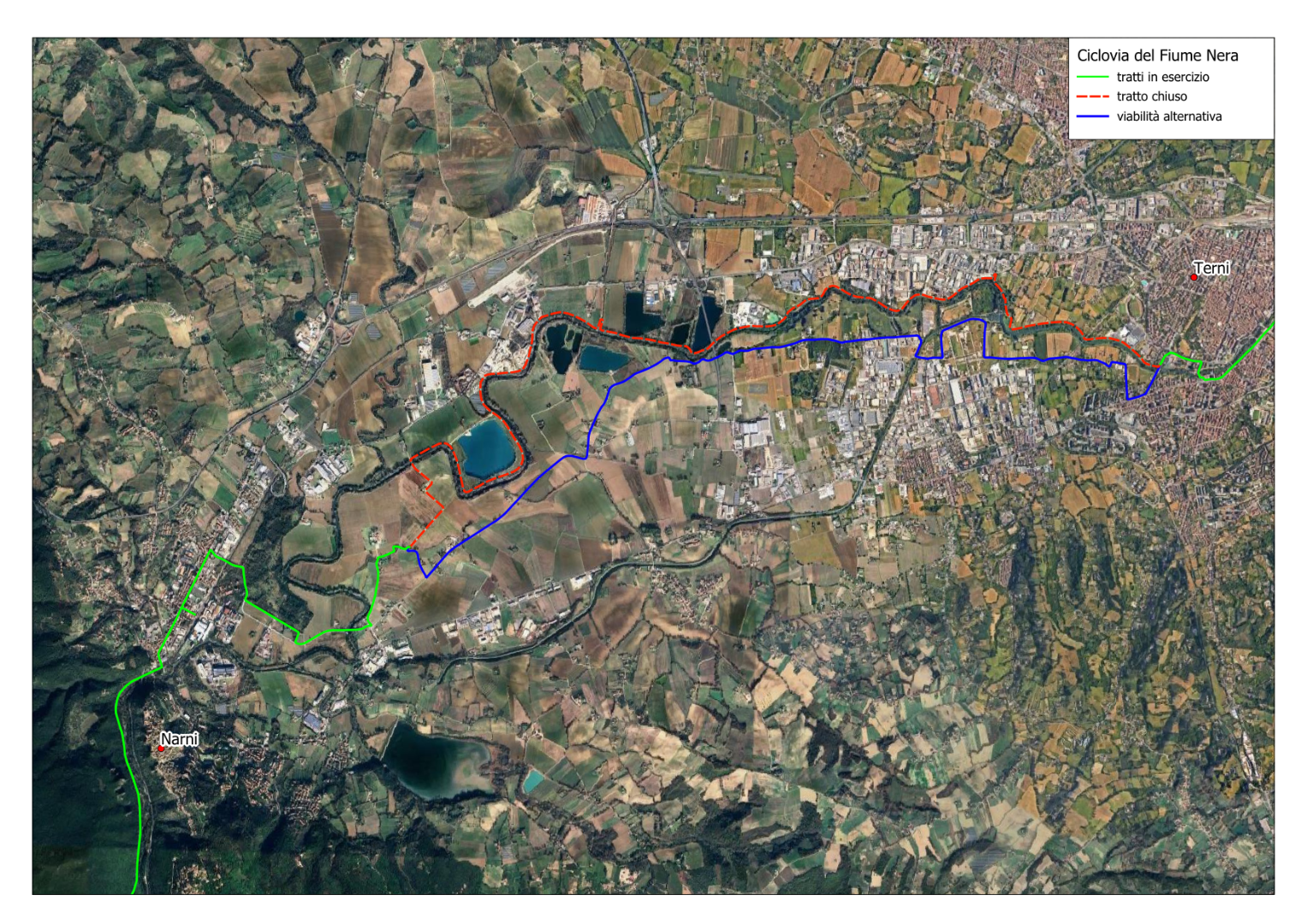 the cycle path is not accessible in the section within the Municipality of Terni (from Ponte Salvator Allende to Fosso Tarquinio); the connection is ensured via the ordinary road network — please pay attention to vehicle traffic.
