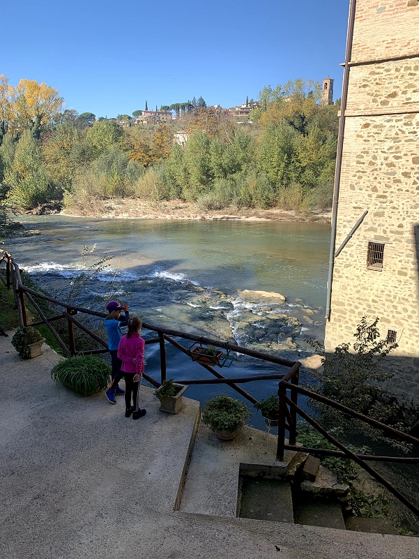 Su strada sterrata si prosegue ora lungo il corso del Fiume Chiascio costeggiando gli antichi molini di cui il territorio è ricco: il Molino della Palazzetta ancora oggi attivo come Molino Silvestri, con l'antico metodo della forza motrice dell'acqua e con macine di pietra che permettono di produrre fior di farina, crusca, tritello e trivellino; è collocato all’interno di quello che si può ritenere un raro reperto della più antica tradizione storica e culturale di questa regione: l’unica torre trecentesca in Umbria che si erge in mezzo all’acqua per circa tre piani. A monte del Ponte di Rosciano, troviamo il Molino, ora proprietà Orcidi, trasformato in abitazione privata dopo la deviazione ottocentesca del corso del Chiascio; a valle del ponte, con torre medievale, sorgeva un mulino per il grano. Prima di arrivare nei pressi del Ponte di Rosciano si possono ammirare le cascate del Fiume Chiascio e la Spiaggetta. Più avanti, si gira a sinistra su Via dei Mulini per poi risalire a sinistra su via Olivello da dove si torna al parcheggio La Torre.