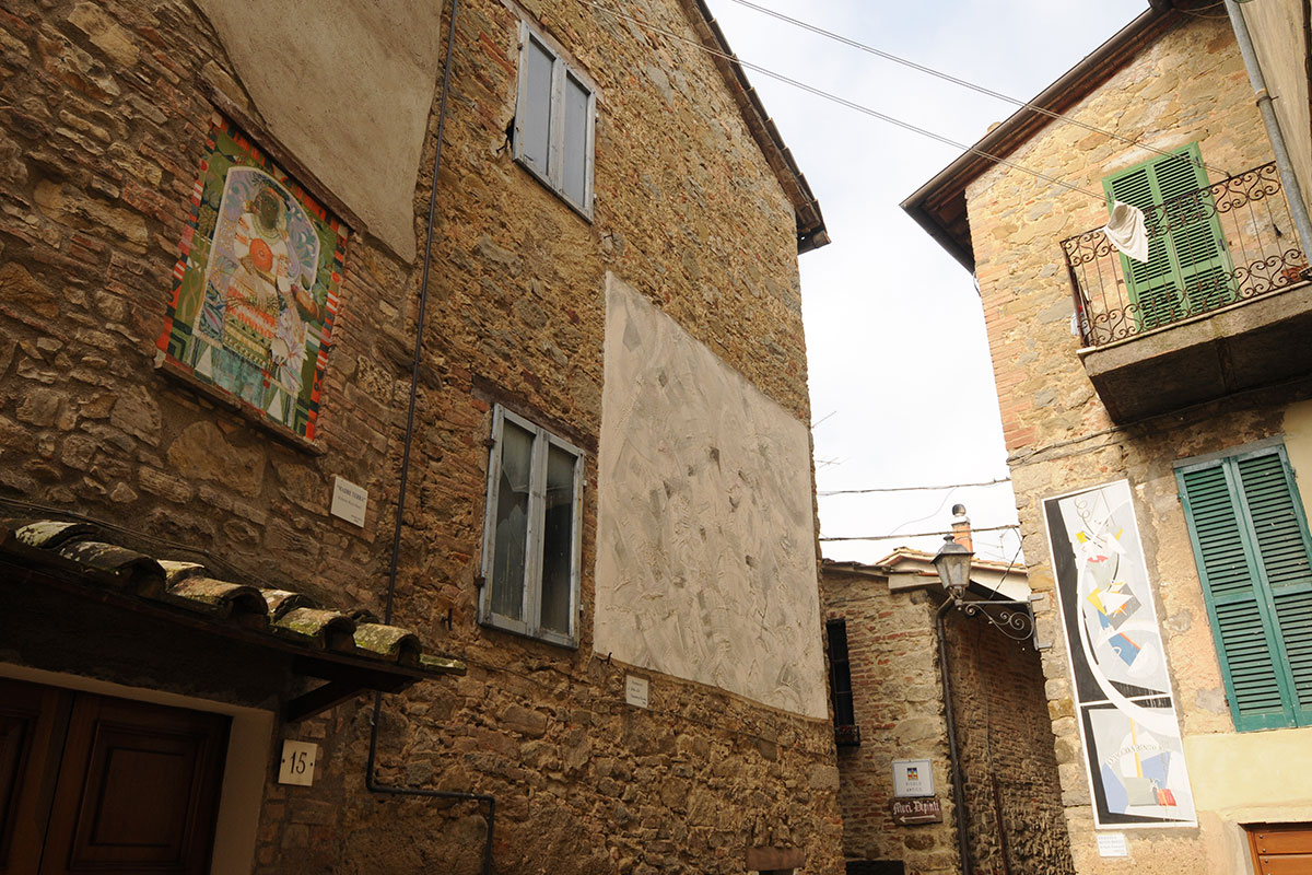 Il nostro giro prosegue in direzione di Mugnano. Il paese vanta una lunga storia di ascesa e declino: la sua fondazione risale all’epoca romana, ma poi rimase abbandonato fino all’anno 1000, quando i monaci benedettini lo dotarono di un’abbazia, che divenne un punto di riferimento anche per le località limitrofe. All’ombra di questa nacque poi il castello, per ospitare la gente che lavorava la terra bonificata. Il monastero decadde nel XIV secolo a causa della contrazione del numero di monaci e il castello fu più volte oggetto di rifacimenti e smantellamenti fino all’epoca napoleonica. Dopo la Seconda Guerra Mondiale il degrado cominciò a impossessarsi del borgo e probabilmente la storia si sarebbe ripetuta se, negli anni Ottanta, il pittore Benito Biselli non avesse chiamato, col benestare dell’Accademia di Belle Arti di Perugia, alcuni artisti per dipingere i muri del borgo. Oggi Mugnano è conosciuto come il paese dei muri dipinti, e se ne contano oltre cinquanta.