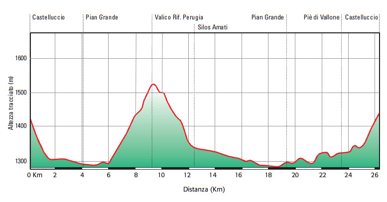La prima parte dell'itinerario, che scorre su asfalto e attraversa il Pian Grande, ti condurrà ai piedi dell'asperità più impegnativa di giornata: circa 3 chilometri di asfalto abbastanza impegnativi da affrontare con calma. Giunto in vetta alla salita concediti una sosta per ammirare il fantastico panorama che vi si aprirà su Castelluccio e sul Monte Vettore.